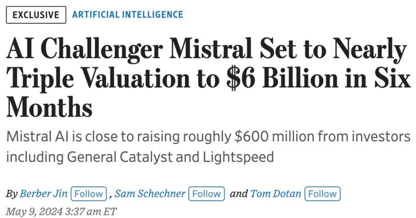华尔街日报报谈,法国AI独角兽Mistral AI行将取得新一轮6亿好意思元的融资,咫尺估值达60 亿好意思元,比半年前翻三倍。据知情东谈主士清晰,现存鼓吹General Catalyst和Lightspeed Venture Partners展望将成为新一轮融资的最大投资者之一。