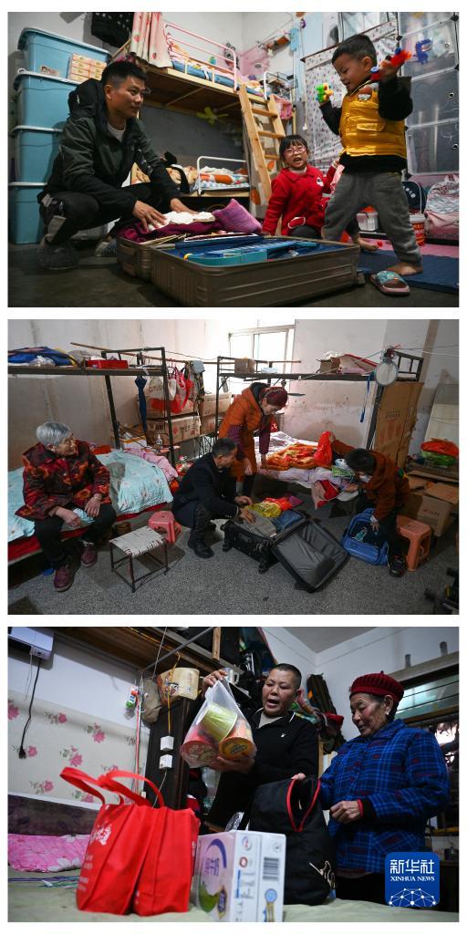 拼版像片,从上到下按序为:川籍务工东谈主员李小铁(左一)过甚儿女在福建福州的出租屋内打理行李(1月12日摄);川籍务工东谈主员常玉凤(左三)过甚家属在福建晋江的出租屋内打理行李(1月12日摄);川籍务工东谈主员曾传富(左一)过甚母亲在福建福州的出租屋内打理行李(1月12日摄)。