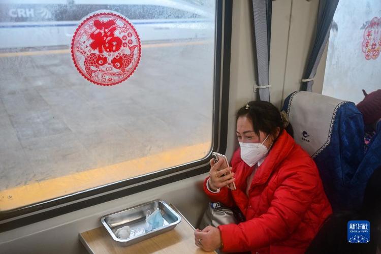 1月13日,在福州火车站,川籍务工东谈主员在K1268次列车上和家东谈主视频。