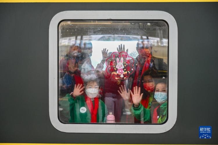 1月13日,在福州火车站,务工东谈主员及家属隔着车窗向火车站服务东谈主员挥手致谢。