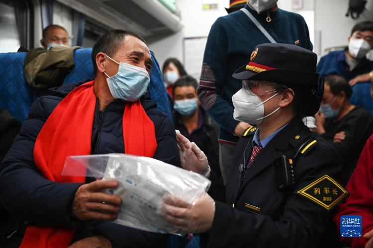 1月13日,乘务员在K1268次列车车厢里为乘客披发防疫健康包。
