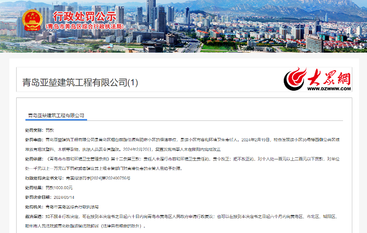 5月14日开云体育,青岛市黄岛区空洞行政司法局对青岛亚堃成立工程有限公司下达青黄综法罚字[2024]第202400756号处罚书,对该单元罚金1000元。