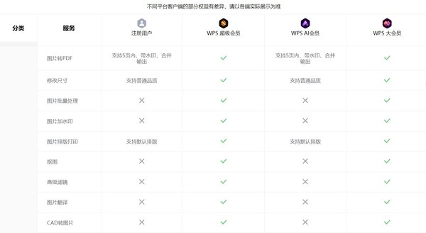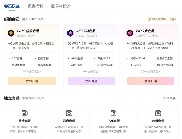 WPS超等会员:PDF套餐、图片套餐、素材库套餐、模板库套餐等200+会员权利。