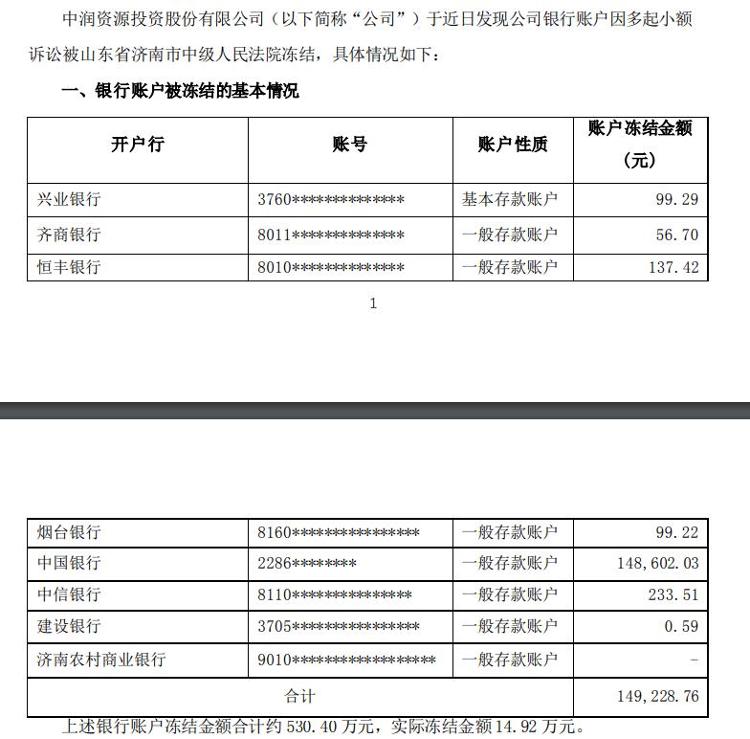 不仅如斯,据5月20日晚间中润资源的公告显现,公司近日发现公司银行账户因多起小额诉讼被山东省济南市中级东说念主民法院冻结,本次被冻结的银行账户有基本户、一般户,冻结金额臆度打算约530.40万元,对公司的资金运营、权谋处理等酿成了一定的影响。